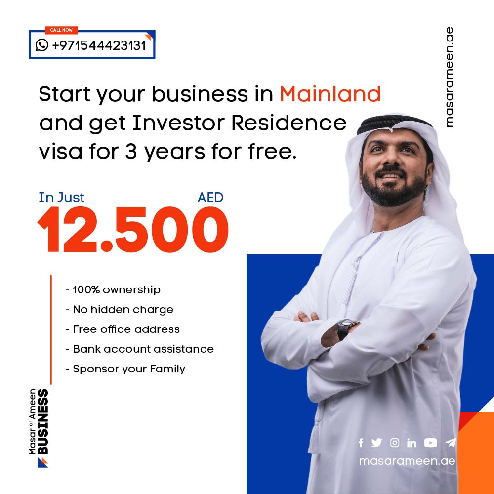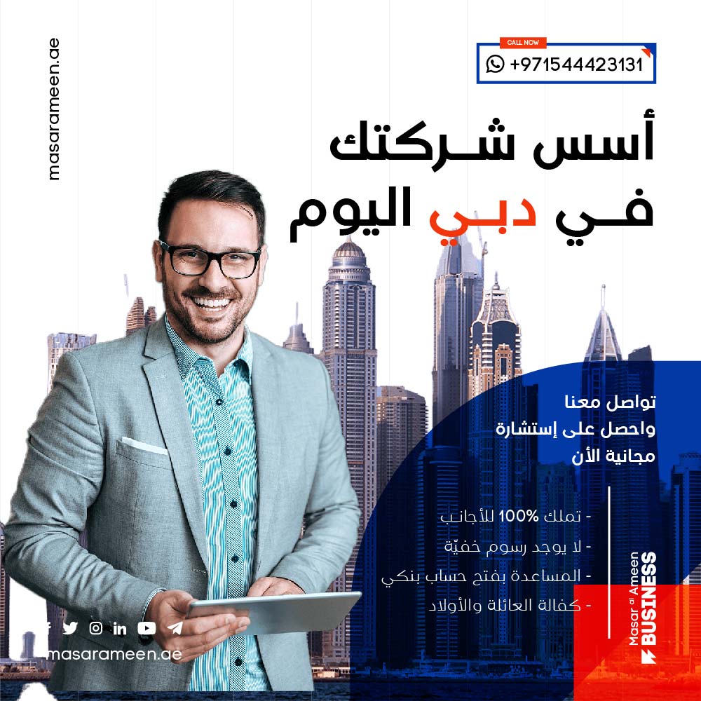 Social media advertising campaign designs for company formation in Dubai for Masar Al-Ameen, in both Arabic and English, United Arab Emirates.
